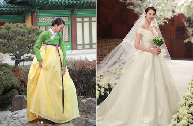 婚礼上的金秀贤无疑是最美的,白色的婚纱完全藏不住小姐姐的完美好身材,盘着利落整齐的新娘发型,整个人真的是美呆了。婚礼当天,小姐姐还换上了一套嫩黄搭配草绿色的韩式礼服,和老公站在传统韩屋前拍摄,在古典背景的衬托下,更凸显出秀贤的典雅优美。