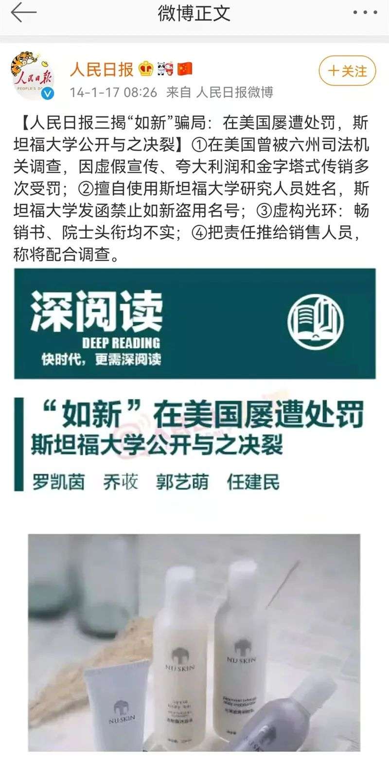2014年,如新在上海的创新总部落成之际,《人民日报》接连刊发《看“如新”怎样编织谎言》《看“如新”怎样攻陷人心》《“如新”公司在美国屡遭处罚斯坦福大学公开与之决裂》三篇报道。